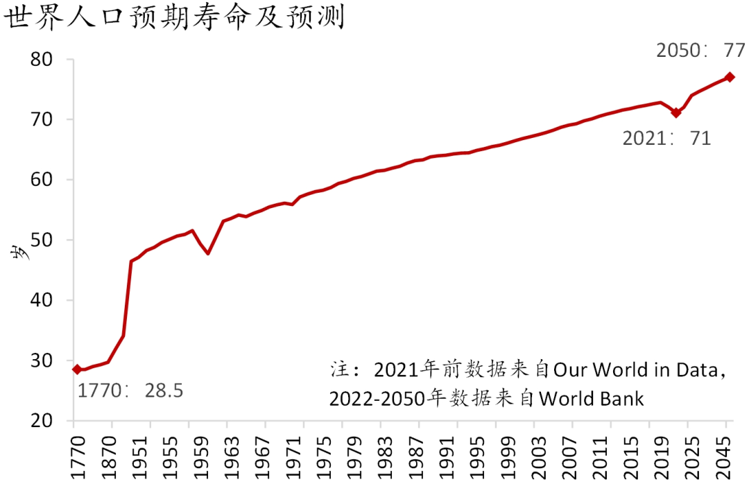 其次是人类预期寿命趋势性延长。数据显示,18世纪中叶至20世纪初的150年间,人类预期寿命长期在30-40岁区间徘徊。随着生活医疗基础设施完善和公共服务水平大幅提升,人类预期寿命在过去100年间翻番,从1913年的34.1岁上升至2019年的72.8岁。世界银行预测,新冠疫情冲击过后,人类预期寿命将继续沿疫前趋势上行(图2)。