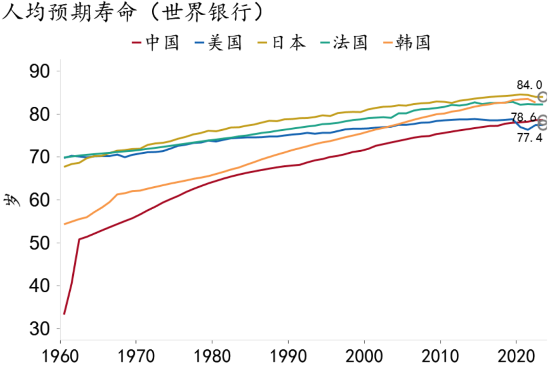20世纪60年代以来,我国预期寿命快速增长,与美日等发达经济体的差距不断缩小,“长寿风险”相应上升。据世界银行测算,2021年中国平均预期寿命78.2岁,较1970年提升超20岁,与美国疫前水平相当(2019年为78.8岁,图4)。