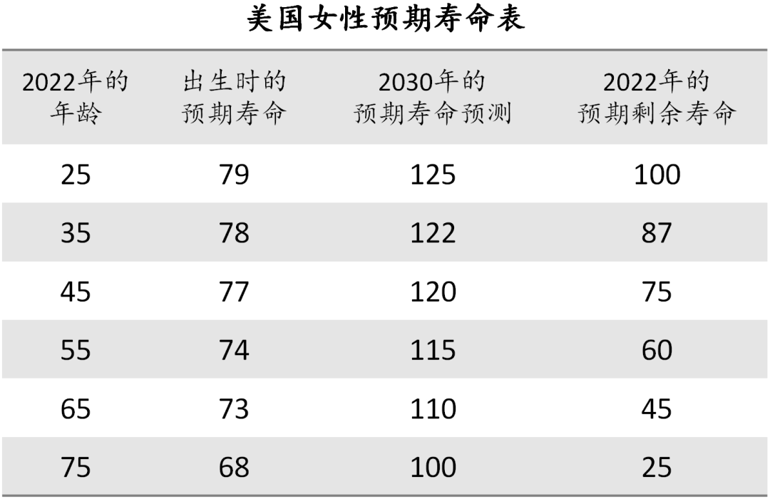 值得注意的是,预期寿命是一个动态概念。随着生命科技的迅速发展,未来人类的预期寿命有可能出现跳跃式增长。人们现在的预期寿命远比出生时要长,未来的预期寿命还将随着年龄的增长而增加。《不老时代》(The Great Age Reboot)【注释1】一书预测,对2022年45岁的美国女性而言,其预期寿命在出生时为77岁,随着科技进步,到2030年时将增长至120岁(图3)。