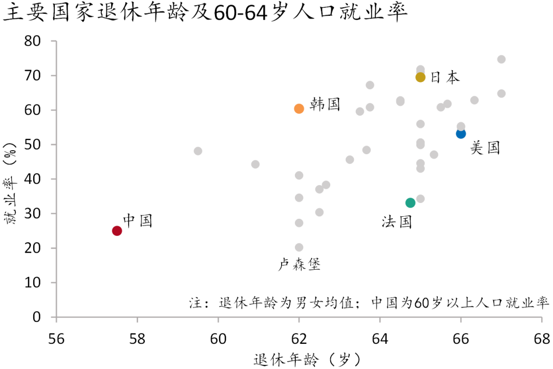 值得注意的是,当前我国法定退休年龄和老年就业率显著低于国际水平,指向我国居民一生中的工作年限偏短(图5)。个人需要在更少的工作年限内完成养老积累,社会则需要供养更大规模的非劳动人口。例如我国养老金待遇在制度设计上的领取年限为15年,那么理论上75岁以上男性和70以上女性,均为潜在“长寿风险”人群,2022年合计占总人口比重升至7.4%。面对预期寿命的持续增长,适当延后退休年龄,总体而言是合乎经济理性的选择。