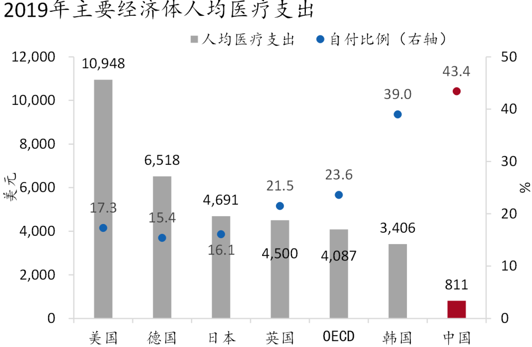 数据显示,我国居民的预防性动机较高。一方面,我国老年人年均医疗保健支出规模及其占总消费的比重均显著高于总体(图6)。另一方面,相较绝大多数OECD国家,我国居民的医疗支出自付比例偏高、受保障程度偏低(图7),需积累更多储蓄应对。