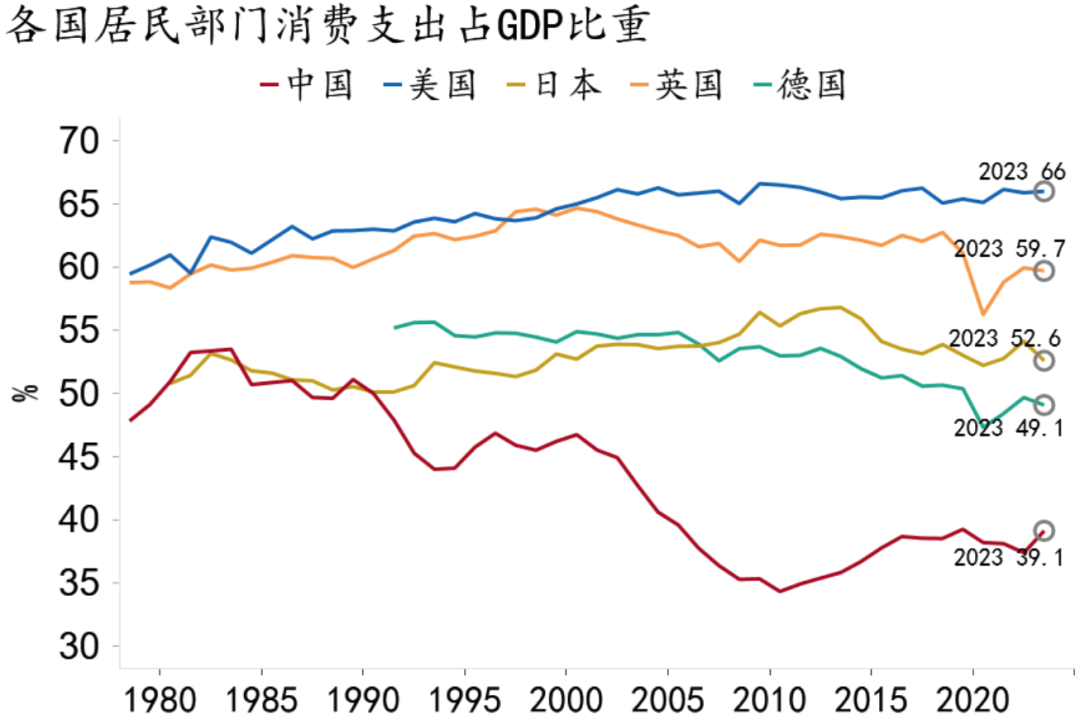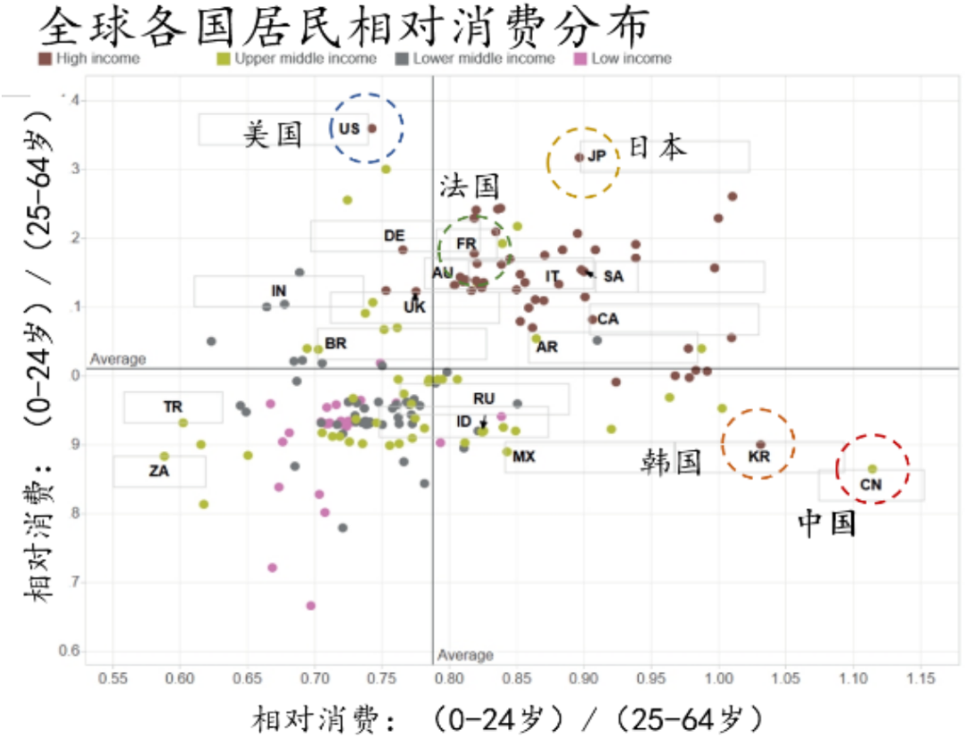 ■ 现实中,居民还会因为预防性动机和遗赠动机,而进一步抑制消费、增加储蓄。这在中国表现得尤为明显。与主要发达国家不同,当前中国居民消费水平随年龄增长而走低,全生命周期的消费曲线可能向下倾斜。