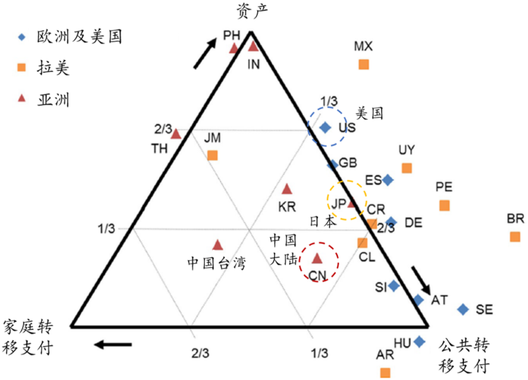 在现代社会中,居民退休后的收支缺口由家庭、金融市场和政府三方共同承担。家庭提供私人转移支付,金融市场提供资产收益,政府构建的公共养老体系提供公共转移支付。