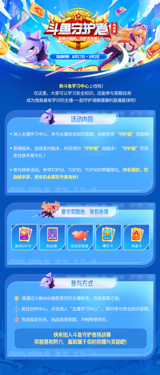 为进一步扩大主播学习中心影响力,8月27日至9月2日,斗鱼还将限时推出【斗鱼守护者-主播答题赢奖励】活动,邀请全平台主播参与,答题赢取“守护盾”,房间VIP卡、粉丝牌、双倍亲密度等福利随机掉落。