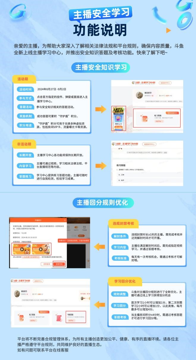 为进一步提升平台内容质量,确保直播生态的规范运营,斗鱼于8月27日全新上线主播学习中心,并推出限时答题赢奖励活动,以鼓励平台主播们积极参与安全学习与内容规则培训。