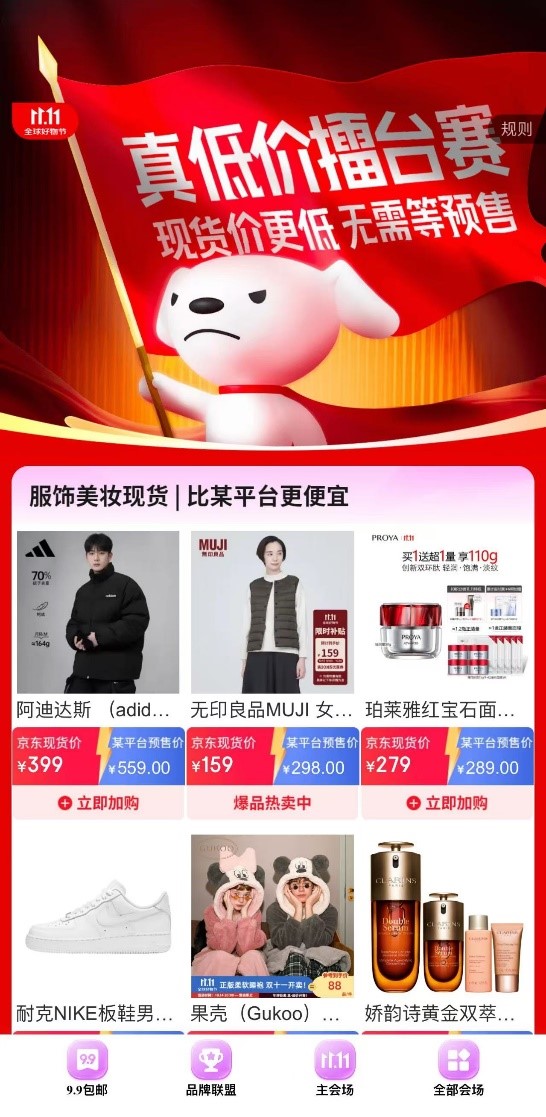 10月17日,京东上线“真低价擂台赛”活动,用户在京东APP首页搜索“真低价擂台赛”可直达活动会场,里面的一系列商品现货价均低于其他平台的同款商品预售价。
