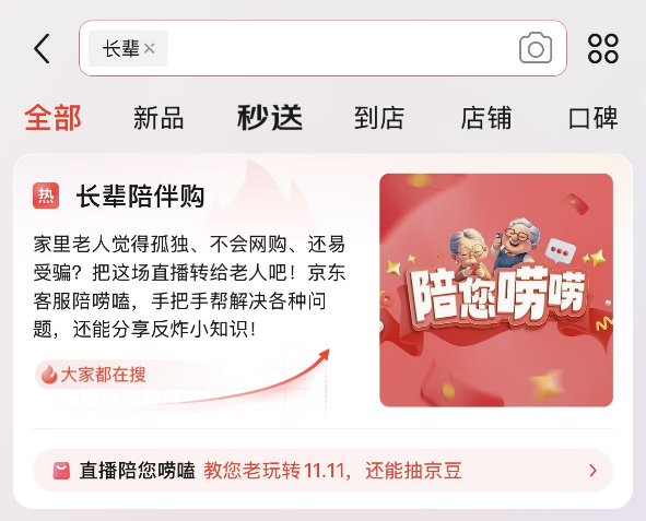 在全网双11直播都在“买买买”、“上链接”的时候,京东却推出了单场持续12小时,不追求黄金时段、不绝对追求销售转化的“陪您唠唠”慢直播。依托京东特有长辈专属客服团队的专业和经验,专门针对银发消费趋势、长辈消费痛点、网购最常遇到的问题等,以京东长辈专属客服搭档专业母婴客服、健康客服、品类采销等内外部嘉宾,从11月4日到11月8日连续开启5场直播,主题涵盖“科学育孙”、“老年人反诈”、“老年人时尚”、“老年养生健康”、“11.11薅羊毛”等方向,每天早8点到晚8点,12小时不停播持续陪伴老人家唠嗑、帮老人家解惑,辅助老人进行网购等。