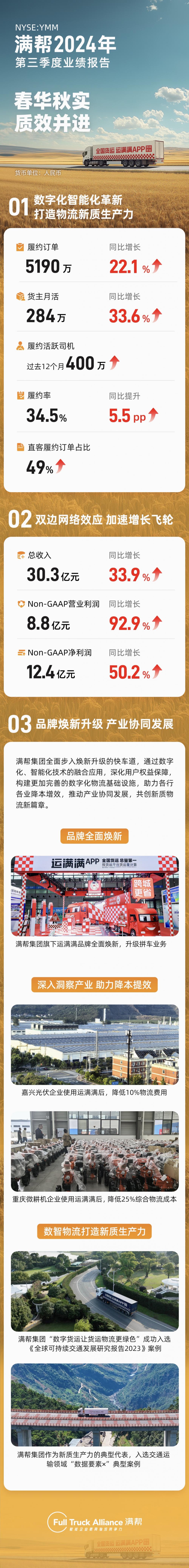 满帮集团董事长张晖表示,三季度以来,满帮的用户规模、匹配效率、订单及收入利润均保持健康增长。满帮持续推进数字化智能化物流变革,帮助货主更省钱,帮助司机多接单、提车效、更赚钱。三季度,集团对运满满品牌进行了全面焕新,并深化司货双会员机制,使用户规模及粘性进一步提升。展望四季度,满帮将持续加大数字化智能化的产品创新,为用户和社会创造更大价值。