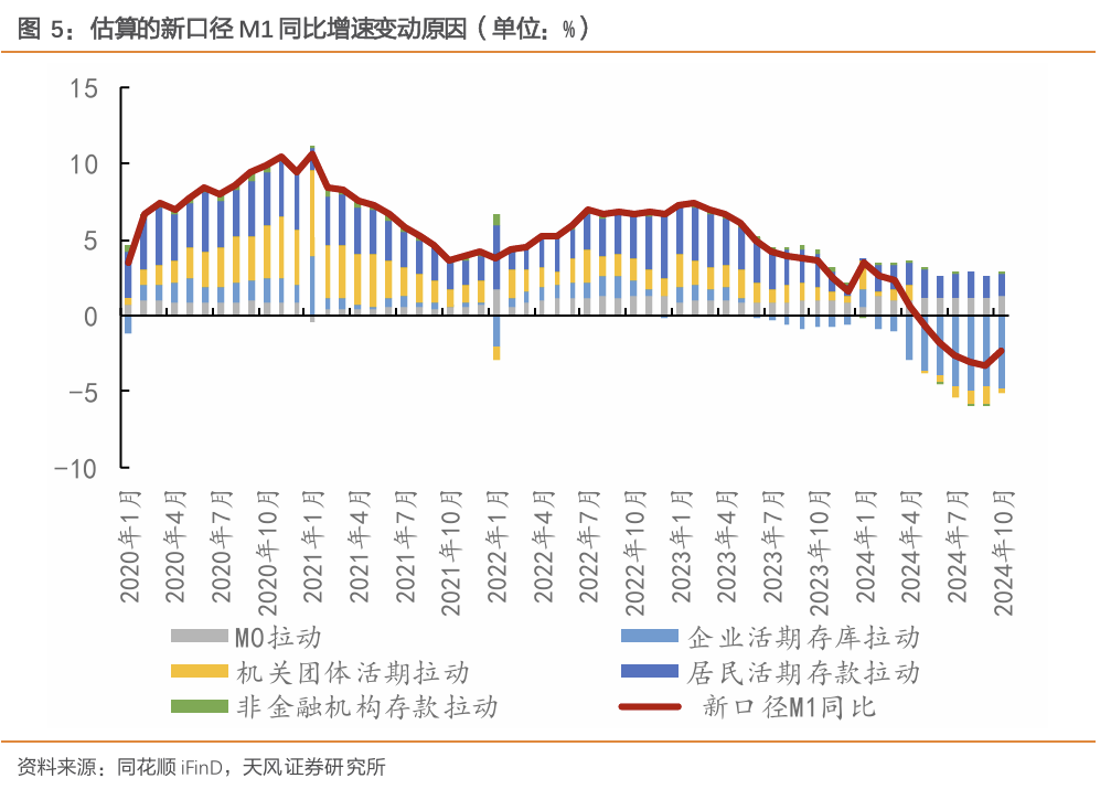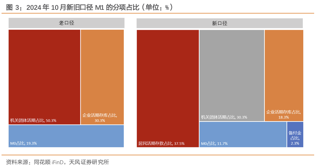 二是随着分项增多,单一科目对 M1的影响减弱,M1同比波动降幅收窄。比如2024年10月,新、旧口径M1同比增速分别为-2.3%和-6.1%。旧口径下M1同比增速降幅大,主要是因为受手工贴息治理影响,企业活期存款大幅走弱,10月企业活期存款对M1同比增速的拉动为-7.7 个百分点。但在新口径下,受企业活期存款占比回落影响,其对M1的同 比的拉动从-7.7收窄至-4.8个百分点。同时,近期居民活期存款对M1的支撑一直稳定在 1.5个百分点左右。这使得今年新口径下的M1同比降幅明显低于旧口径下的M1同比增速。