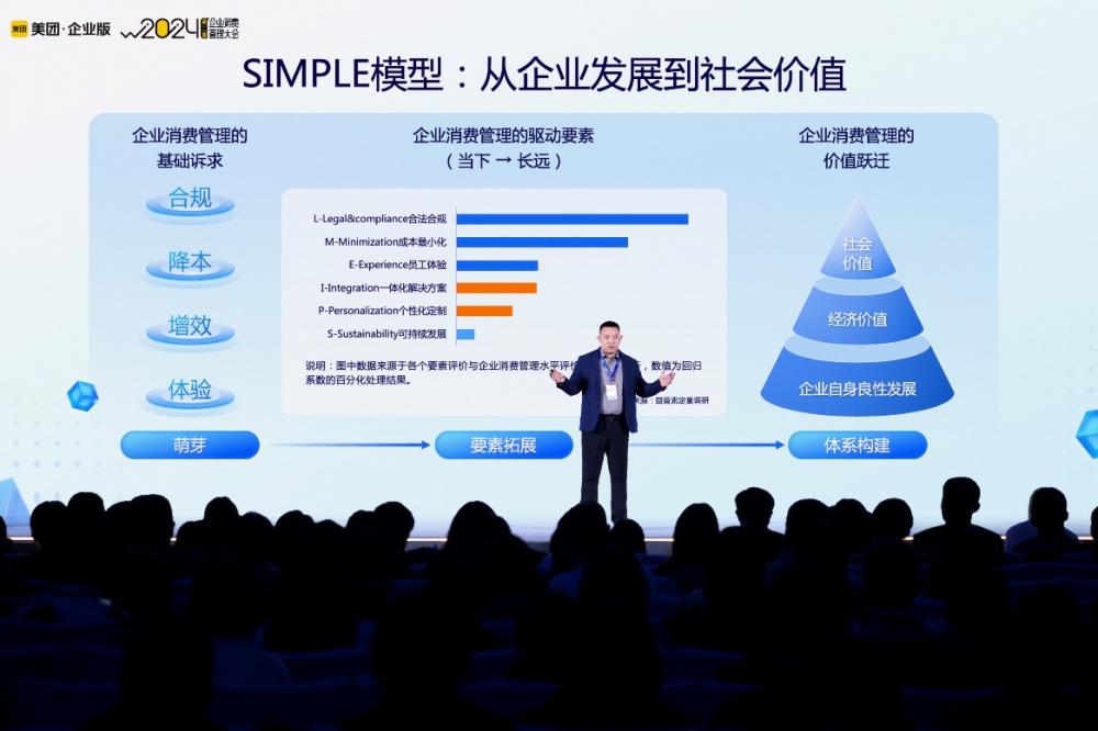 会上,人大商学院、美团企业版、美团研究院与益普索联合发布《企业消费管理白皮书》,推出SIMPLE模型,从可持续发展、一体化解决、成本最小化、个性化定制、合规、员工和客户体验六个维度概括了企业消费管理指标体系,为满足企业消费管理诉求与数字化转型提供了可实践的方法指引。