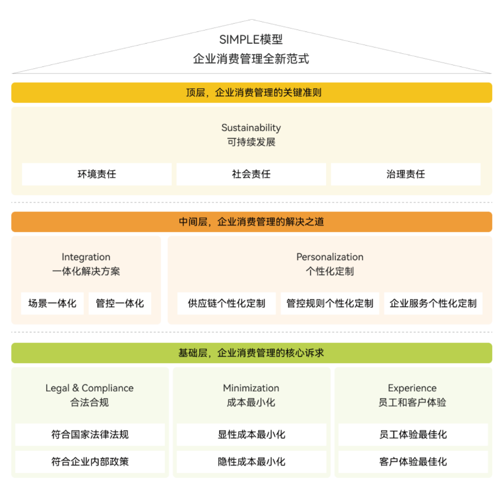 《企业消费管理白皮书》中指出,遵循SIMPLE 模型,企业能够精准把控消费管理的核心环节,实现资源的高效配置与运营效率的提升,同时有效规避合规风险,确保企业在追求经济效益的同时,兼顾社会责任和环境保护,推动企业向绿色、低碳、可持续的方向发展。