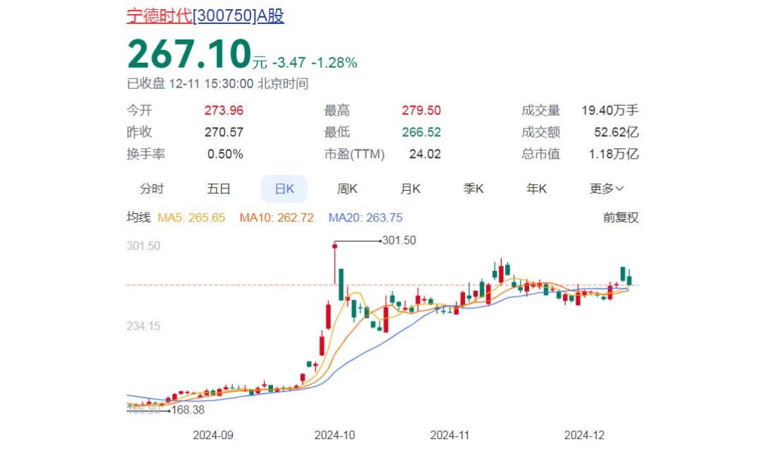 曾毓群掌舵的宁德时代,已重回万亿市值。12月11日,收盘报267.1元,较三个月前涨超四成。