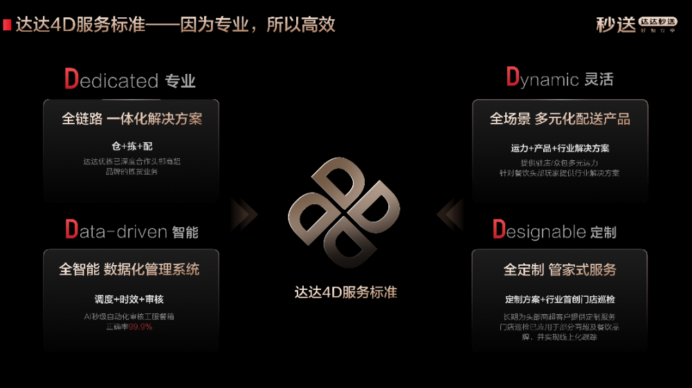 作为餐饮行业的重要评价体系,“首席餐饮赋能平台”评选主要挖掘能够为餐饮商家提供专业、全面服务的平台企业。达达秒送基于多年服务头部餐饮品牌的经验,打造达达4D服务标准帮助餐饮商家有效解决外卖配送痛点,提升服务品质。