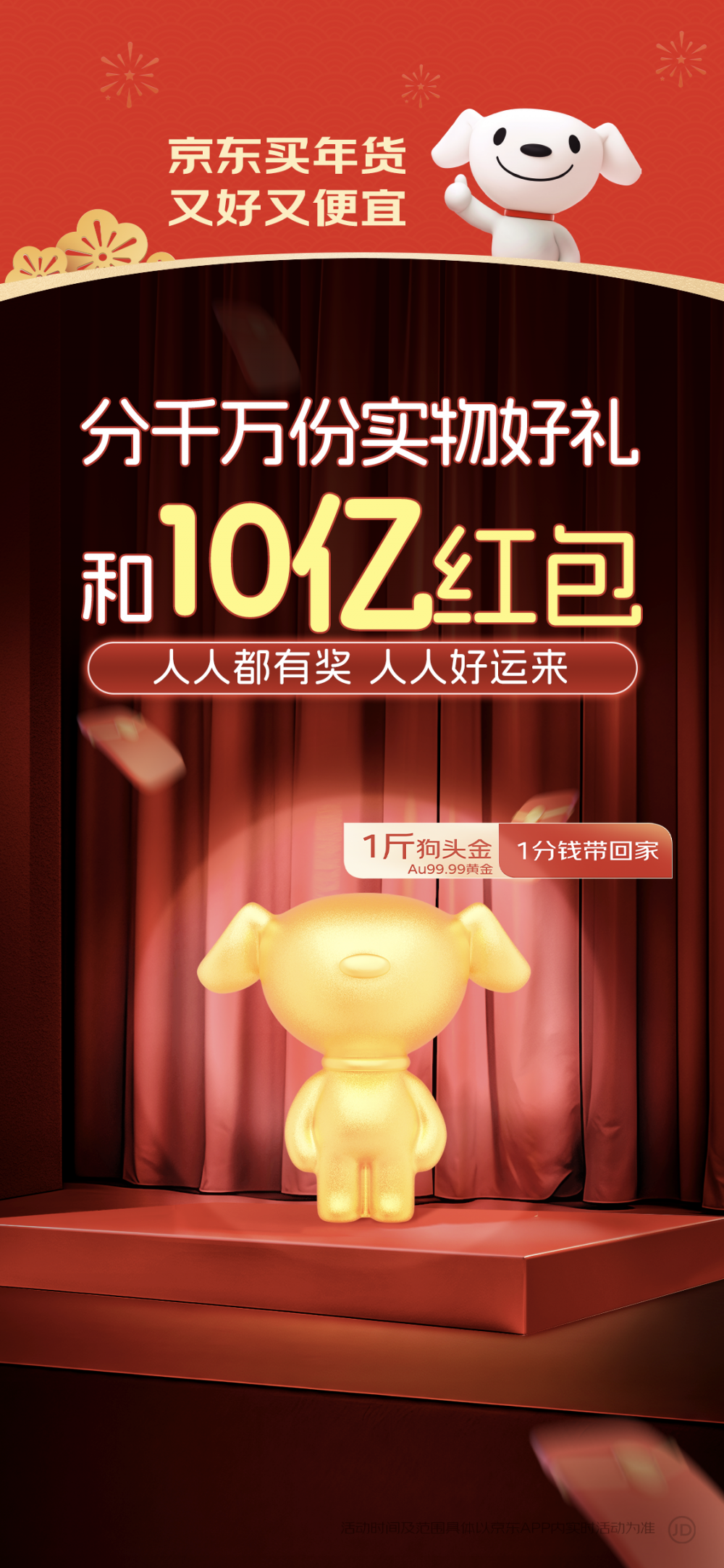 除了京东年货节为用户准备的丰富年货好物,12月31日跨年夜当晚,京东还将携手湖南卫视芒果TV,为广大观众及消费者带来“人人有奖”的惊喜福利,其中就包括重达1斤的高纯金(AU99.99黄金)“狗头金”大奖。