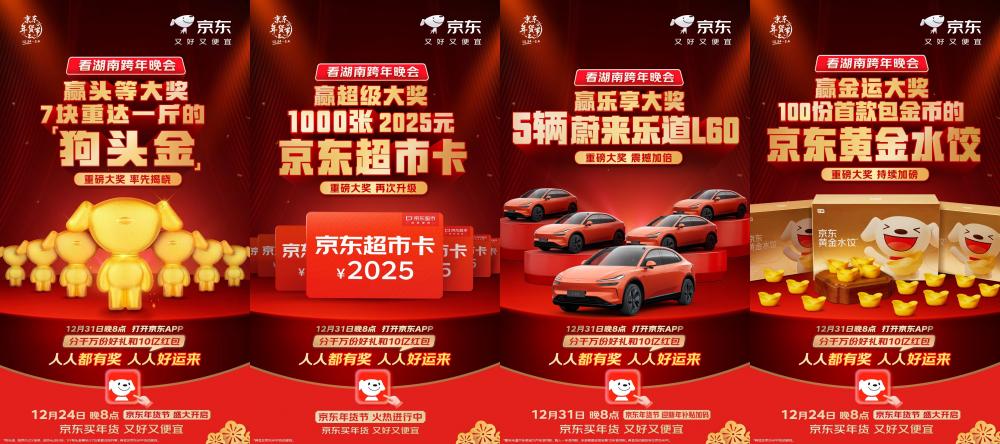 此次由京东提供的湖南跨晚互动大奖十分“豪华”,不仅有7块重达1斤的“狗头金”(Au99.99黄金)、1000张2025元京东超市卡、5辆蔚来乐道L60汽车(累计最高10年使用权)以及包金币的京东黄金水饺等重磅大奖,更有京东携手品牌、商家提供的千万份好礼和10亿红包。