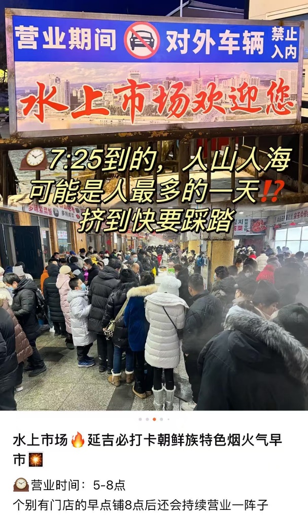 大众点评上,许多网友把水上市场列为“延吉必打卡”项目,并发布各种早点摊排队攻略。进入严冬,早市内却热火朝天。许多小吃摊排起长队,人参、明太鱼等特色农副产品摊位也颇受欢迎。