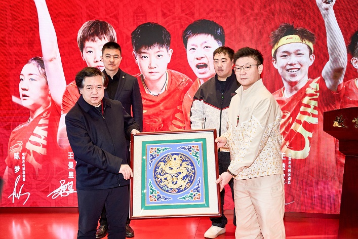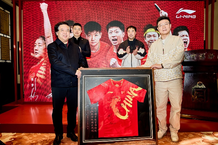 活动中,李麒麟代表李宁公司向故宫博物院赠送由2024巴黎奥运会中国国家乒乓球队六位冠军运动员签名版龙服作为纪念,以体育中的拼搏精神致敬故宫为代表的中华优秀传统文化中坚韧不拔的民族精神。故宫博物院也将2025年故宫建院百年特别奉献版《故宫日历》和故宫文创产品《金龙彩画》赠与李宁公司。