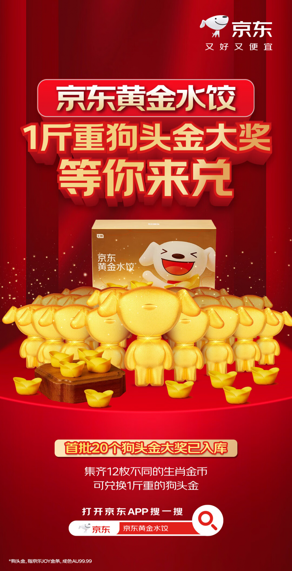 黄金水饺是2024年底京东基于“饺子包钱币”这一民俗推出的创新产品,旨在将传统美食与现代元素相结合,在传承传统文化的同时为消费者带来全新的购物体验。这款水饺每一盒中除可食用水饺外,都藏有一枚1g或5g重的Au99.99生肖金币,用户集齐全套12枚不同生肖的金币并完成防伪卡认证后,可兑换一斤重的“狗头金”(Au99.99)。