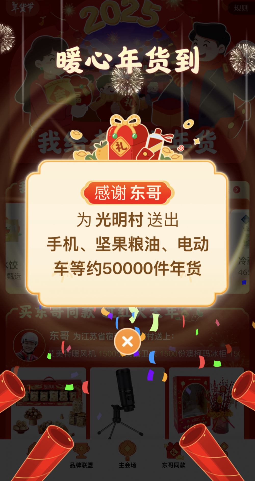 1月6日,京东联合超百大品牌、名人发起全国最大规模的“我给老家送年货”活动,旨在将满载深情厚谊与美好祝愿的年货送往天南地北,为每一个渴望团圆、期盼年味的家庭带去温暖与祝福。据“我给老家送年货”活动页面显示,“东哥”刘强东下单的约5万件年货已陆续送往自己的老家江苏宿迁来龙镇光明村,为1500户村民送去新春的祝福,其中不乏冰柜、电饭煲、取暖器、保温壶、多功能锅、餐具套装和蛇年毛巾礼盒等过年必备的实用家电家居产品。
