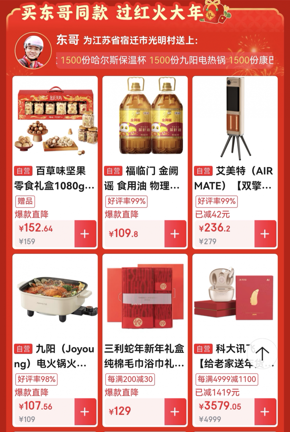 据了解,此次“东哥”刘强东给老家乡亲们所购的年货,涵盖家电、家居、服装、食品、酒水、3C数码等不同品类。“东哥”同款的家电家居产品,包括囤年货必备的澳柯玛100升低霜冰柜、让团聚时刻更加温暖的艾美特石墨烯暖风机、满足全家围坐共享美食的九阳多功能料理电热锅和康巴赫鸳鸯多功能锅等。此外,还有送礼自用皆相宜的三利纯棉毛巾蛇年礼盒、康琴奶油风餐具18件套,以及招待亲朋必备的哈尔斯不锈钢保温壶和广意分格零食收纳盒等,每一件都透露着对家人的深厚情谊。更有飞科博锐小陨石智能电动剃须刀、美的电饭煲等好物年货,为老家的生活带来更多便捷与舒适。现在在京东购买这些“东哥”同款商品,部分地区还可享国家补贴至高8折优惠,到手更划算。