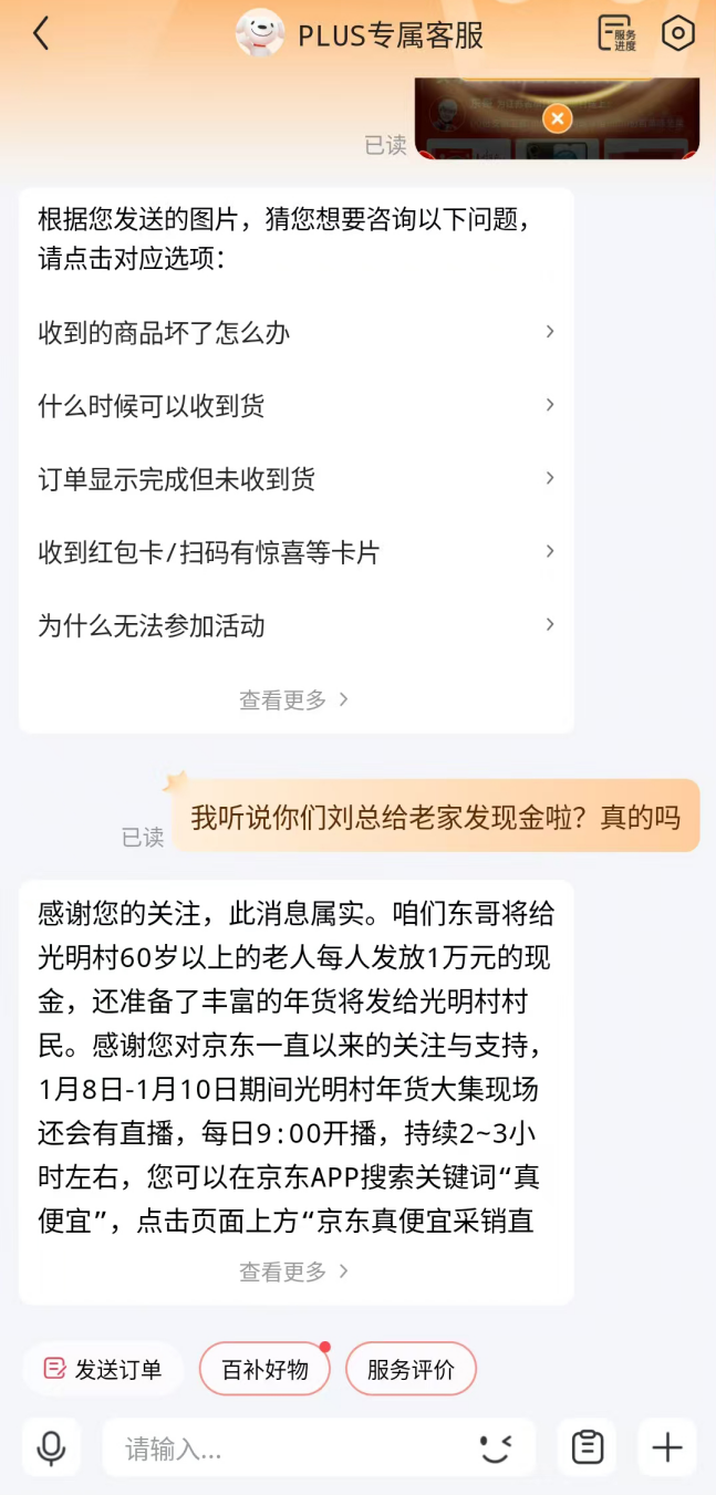 身为光明村走出去的企业家,刘强东近几年来一直在用实际行动诠释“饮水思源”。2024年春节,刘强东就曾为村民们送上了超过1000件保暖羽绒服和1000余份超市礼盒。刘强东今年将给家乡父老发放现金,其中60岁以上老人发放一万元。消息一出,即有网友前来询问京东客服,客服也对此做出肯定的答复,称“消息属实”。