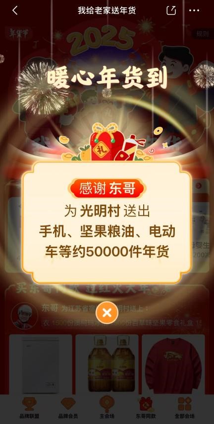 近日,刘强东再次为老家江苏宿迁光明村村民置办年货的消息引发网友热议。据了解,京东“我给老家送年货”活动已经启动,“东哥”刘强东一口气为老家光明村1500户村民下单了共计约5万件年货好物,为每家每户送出包括吃喝穿戴三十多款商品,包括手机、坚果粮油、电动车等!网友纷纷表示,光明村村民实在太幸福了,实名羡慕!
