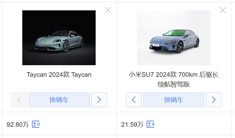 以指导价92.80万的2024款Taycan对比指导价21.59万元的小米SU7为例。