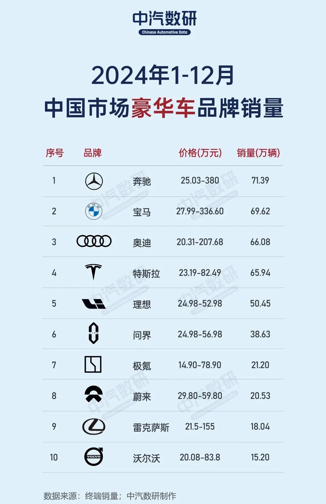 传统豪车依然有市场地位。2024年中国市场豪华品牌销量榜显示,BBA仍包揽排行榜前三名,把一众新能源车品牌甩在身后。