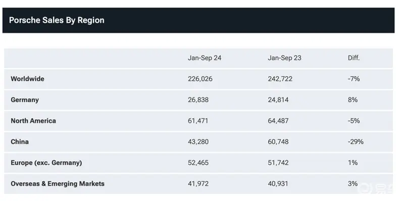 保时捷2024年的数据还未披露,但季度数据可见其困境。2024年前九个月,保时捷中国区销量下降了29%,仅为4.3万。中国市场不再是保时捷销量第一区域,滑落至全球第三。