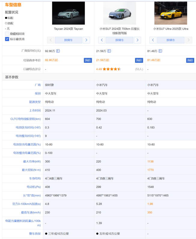 ▲Taycan和su7各车型对比。图片来自汽车之家。