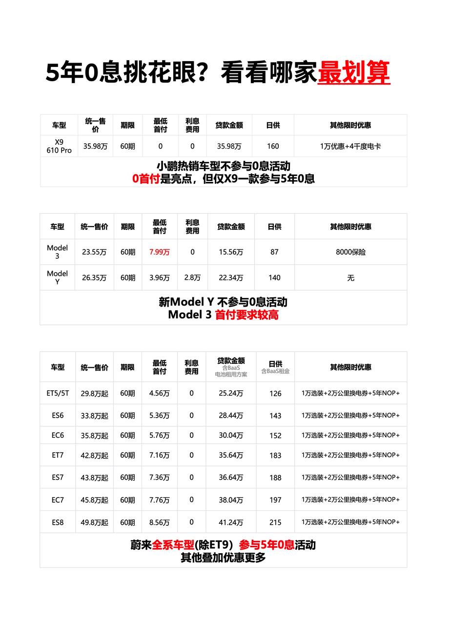 虽然上述三家都推出颇具吸引力的政策,但对比可以发现,小鹏支持5年0息的车型仅有小鹏X9一款车型,其余G9、G6、P7i等几款车型都只有3年免息政策。特斯拉最畅销的Model Y换为新款之后不提供5年0息政策,5年0息方案仅适用于Model 3焕新版车型,且首付比例需达到34%。