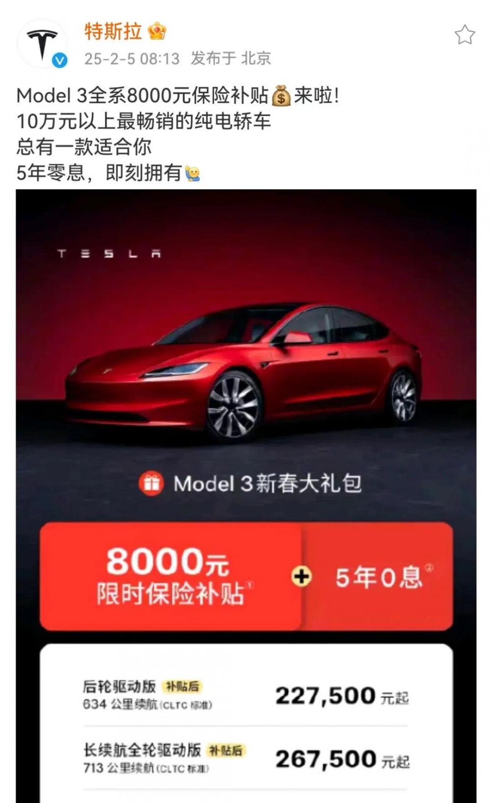 特斯拉针对Model 3推出“限时保险补贴8000元+5年0息+充电权益”,这是特斯拉保险补贴首次覆盖Model 3全系车型包括Model 3高性能版,这也是保险补贴和5年0息政策的同框。按照目前的政策,购买特斯拉Model 3最低首付仅需79,900元,月供低至2,593元/月。但特斯拉的政策仅仅针对Model 3,刚焕新的Model y并不享受上述政策。