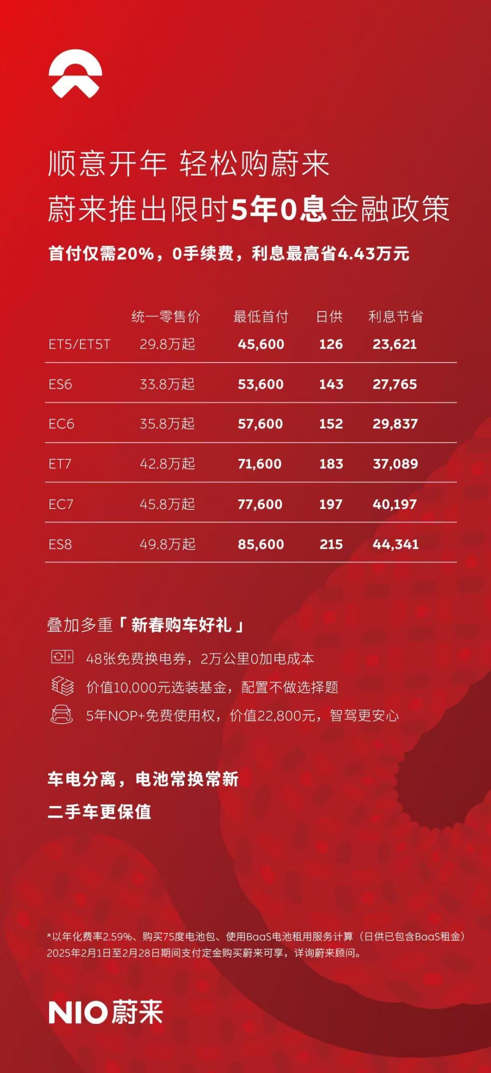 2025年新能源汽车市场竞争甫一开局便进入白热化。春节假期刚过,特斯拉、蔚来、小鹏等头部品牌相继推出“5年0息”为核心的金融政策,掀开新一轮市场争夺战。蔚来率先宣布5年0息政策,并通过换电及智驾权益等,覆盖用户“买车-用车-换车”的全生命周期,特斯拉将保险补贴与免息政策叠加,小鹏则推出“0首付+5年0息”政策。