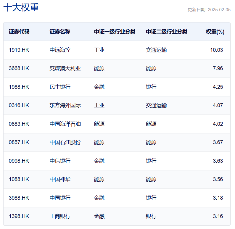 从指数编制方案看,港股红利ETF(513833)所跟踪的中证港股通高股息投资指数更为科学精妙,红利属性相对更强。其从符合港股通条件的香港上市公司证券中选取30只流动性好、连续分红、股息率高的上市公司证券作为指数样本,采用股息率加权的方法编制而成,用于反映港股通范围内连续分红且股息率较高的上市公司证券的整体表现。在行业分布上,该指数具有较明显的“周期+金融”特征,30只成份股重点聚焦港股分红更高的金融、工业、能源等行业。