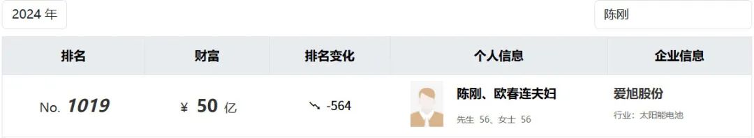 行业阵痛,直接反映在陈刚的财富值上,在2024年胡润百富榜上,陈刚夫妇的身家为50亿元,较上一年缩水80亿元。