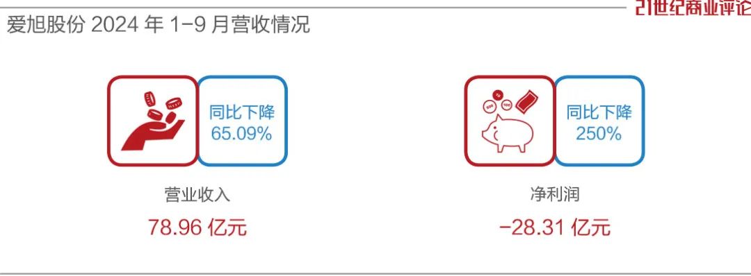 2024年1-9月,爱旭的营收为78.96亿元,同比下降65.09%;净亏损28.31亿元。