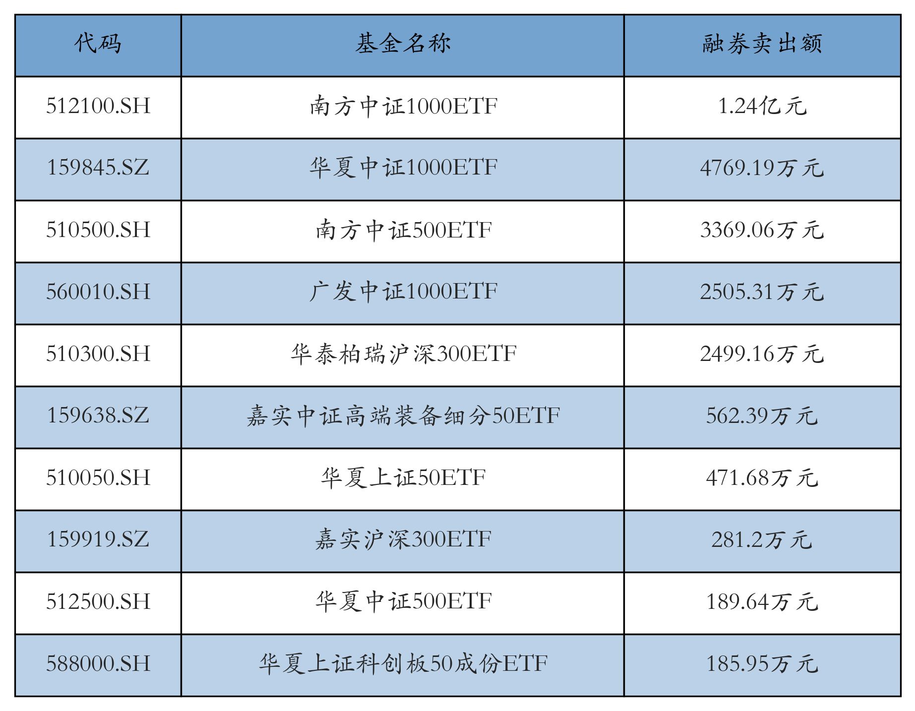 2月17日ETF融券卖出额前三位分别为:南方中证1000ETF(1.24亿元)、华夏中证1000ETF(4769.19万元)和南方中证500ETF(3369.06万元),前10具体见下表: