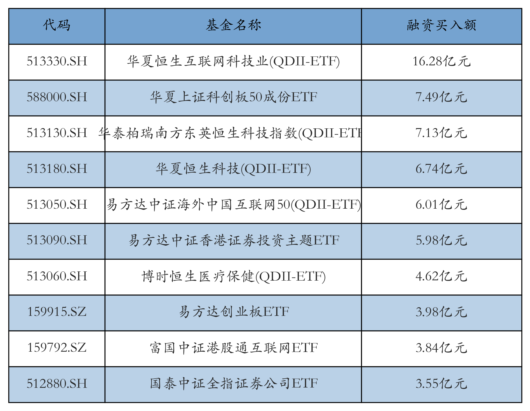 2月17日ETF融资买入额前三位分别为:华夏恒生互联网科技业(QDII-ETF)(16.28亿元)、华夏上证科创板50成份ETF(7.49亿元)和华泰柏瑞南方东英恒生科技指数(QDII-ETF)(7.13亿元),前10具体见下表:
