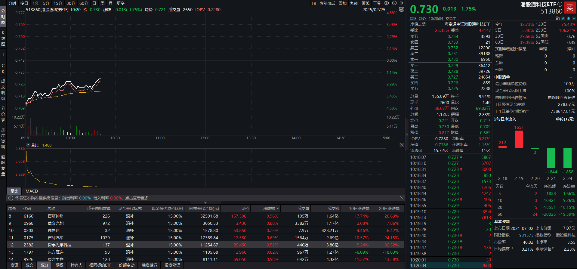相关ETF方面,截至发稿,港股通科技ETF(513860)低开后走高,现跌1.75%,盘中换手率9.99%,溢折率0.32%,盘中频现溢价交易。成分股方面,微创机器人-B涨超13%,理想汽车-W涨超6%,微创医疗、晶泰控股-P、零跑汽车等跟涨。