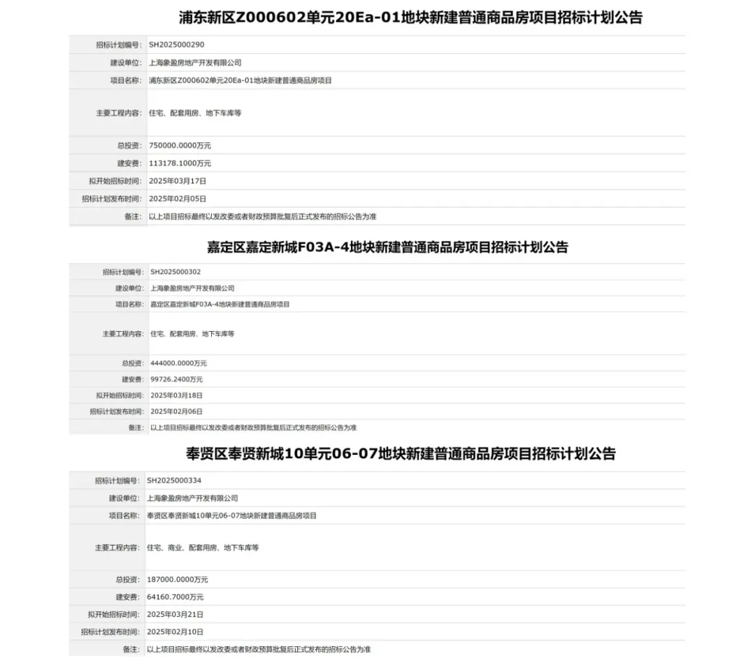 一开年,象屿旗下“上海象盈房地产”连发三条招标预告,瞄准奉贤区、浦东新区、嘉定新城三个地块,计划总投资超138亿元。