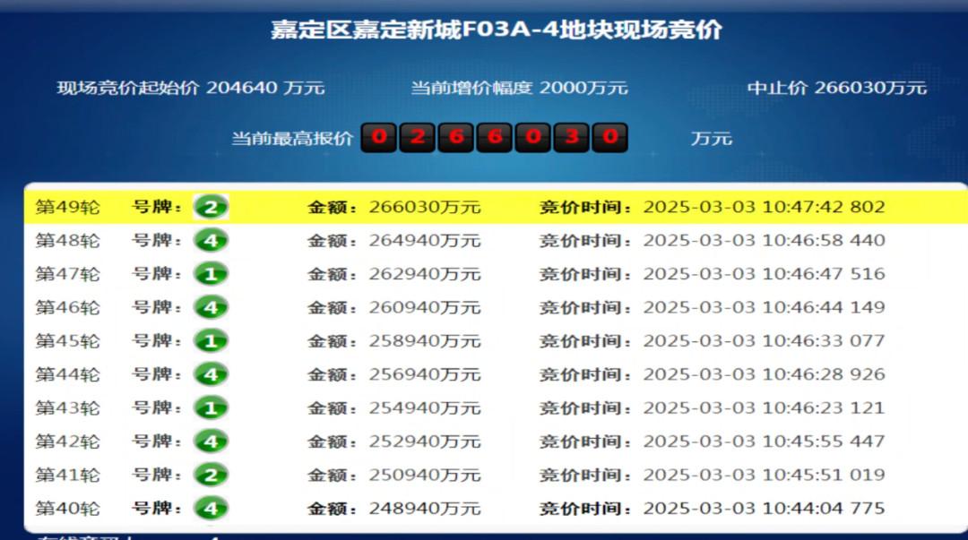 3月3日,上海第二批次土拍,象屿看中的嘉定新城地块,起始价20.46亿元,吸引4家房企参与竞夺,经过49轮竞价,最终被招商蛇口收入囊中,成交楼面价31850元/平方米。