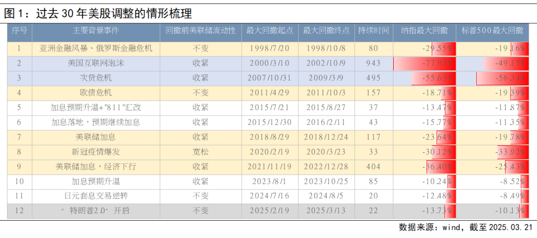 结合历史经验,过去30年美股的调整大致可分为三种情形:其一,当经济系统性受挫时,标普500跌50%左右,如科网泡沫破灭、次贷危机;其二,当经济进入下行周期,标普500跌20%-30%左右,如欧债危机蔓延、美联储进入加息周期、新冠疫情爆发等;其三,当经济下行风险升温,但未出现实质性衰退时,标普500跌10%左右,如美联储加息预期升温、日元套息交易逆转等。