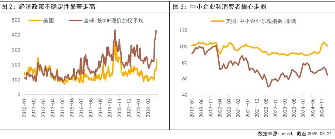 此外,鲍威尔也表达了对经济不确定性的高度关注,2月美国经济政策不确定性指数升至历史高位;传导至微观,不确定性会产生“观望经济”,使消费者和企业倾向于推迟或减少消费和投资,当消费者更不愿意增加消费、企业更不愿意雇佣员工和扩大资本开支,就会导致经济活动放缓,从而加剧下行压力。