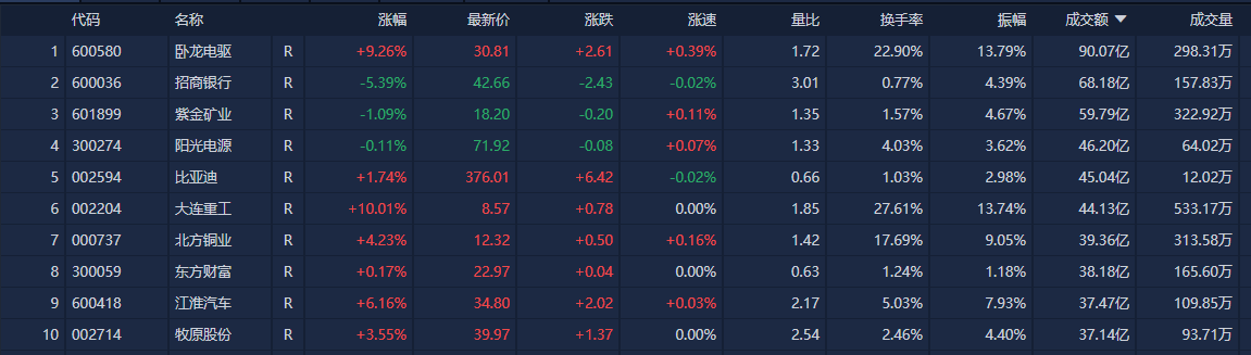 个股方面,卧龙电驱成交额超90亿元,招商银行、紫金矿业、阳光电影等成交额靠前。