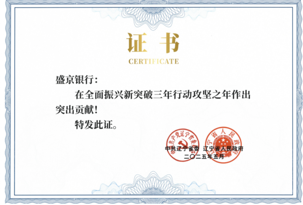 2024年是辽宁全面振兴新突破三年行动的攻坚之年,作为根植辽沈的总部银行,盛京银行按照省市党委安排部署,积极融入全面振兴新突破三年行动,持续深化金融改革创新,将服务区域经济高质量发展作为核心使命,全力支持辽宁打造新时代“六地”目标和“八大攻坚”任务。这份荣誉,是省委、省政府对盛京银行深耕本土、服务地方的充分肯定与高度认可。