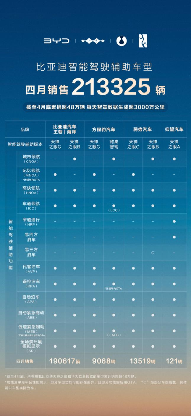 数据显示,比亚迪4月国内乘用车销量突破30万辆。其中,智驾车型渗透率达71%,搭载智能驾驶辅助系统的车型以21.3万辆的月销量、截至4月底超48万辆的累计销量,位居智能辅助驾驶车型销量榜首。