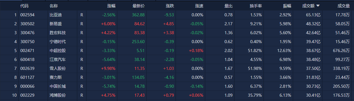 个股方面,比亚迪成交额65.13亿元,新易盛、胜宏科技成交额在40亿元之上。