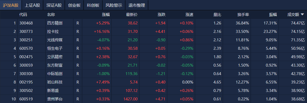沪深两市全天成交额1.21万亿元,较上个交易日缩量78.7亿。个股方面,四方精创成交额超74亿元居首,拉卡拉、光线传媒、恒生电子成交额靠前。