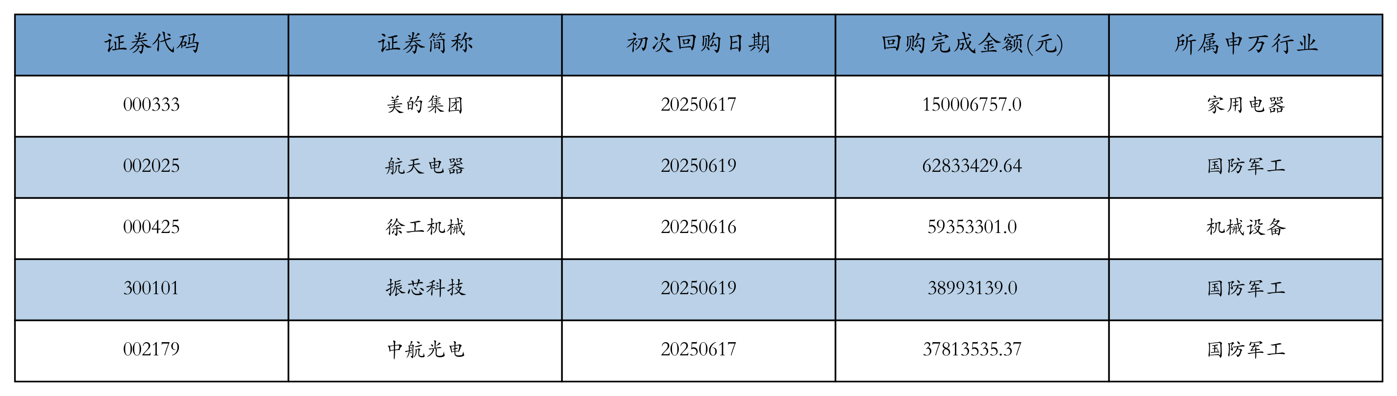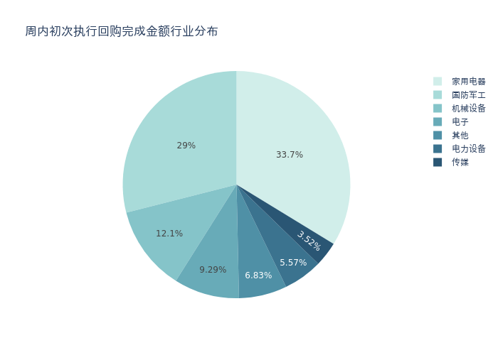 按照初次执行金额所在不同行业分布,金额最高的3个行业分别为:家用电器、国防军工、机械设备,详情见下图: