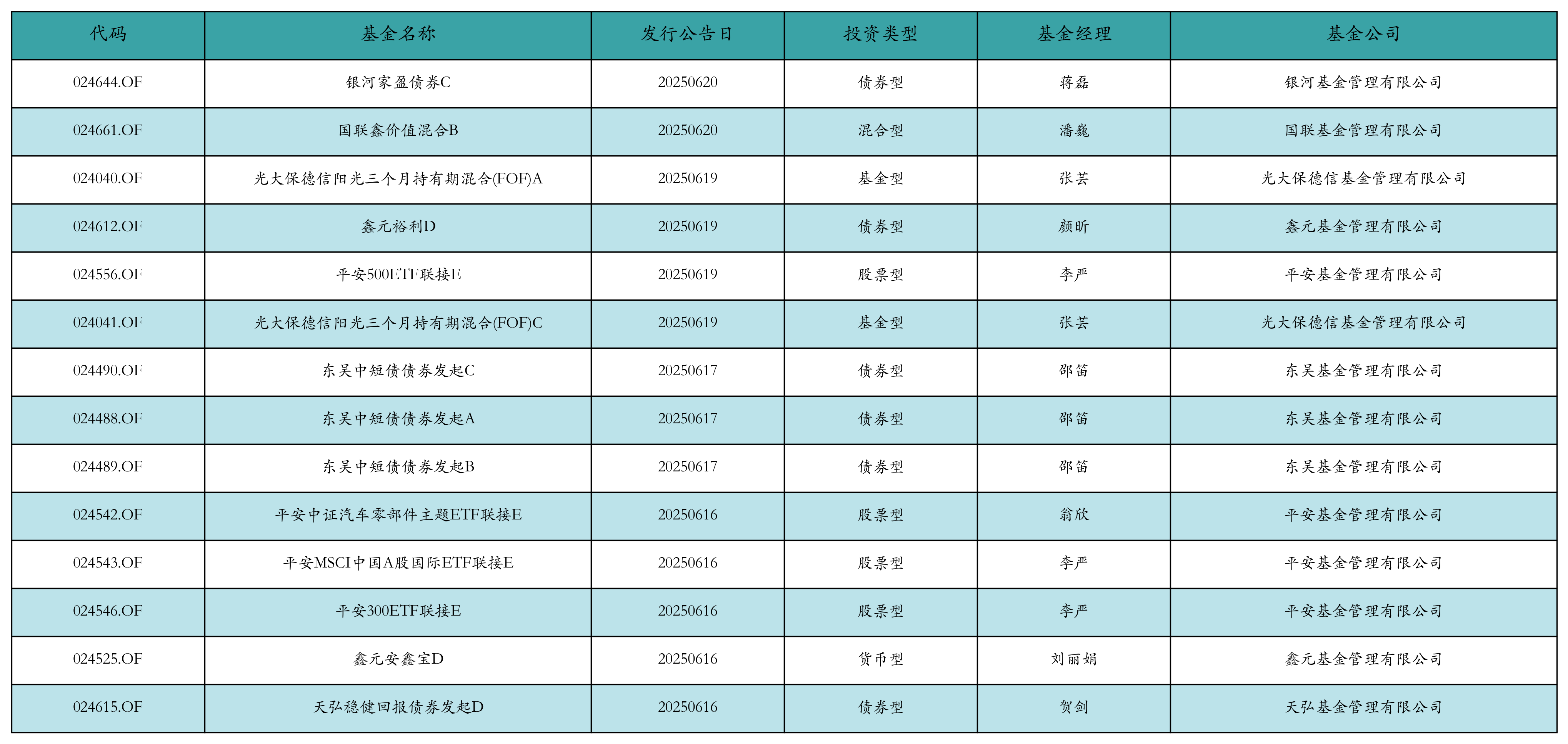 上周有14只新基金发行,分别为:银河家盈债券C、国联鑫价值混合B、光大保德信阳光三个月持有期混合(FOF)A、鑫元裕利D、平安500ETF联接E、光大保德信阳光三个月持有期混合(FOF)C、东吴中短债债券发起C、东吴中短债债券发起A、东吴中短债债券发起B、平安中证汽车零部件主题ETF联接E、平安MSCI中国A股国际ETF联接E、平安300ETF联接E、鑫元安鑫宝D、天弘稳健回报债券发起D,详情见下表: